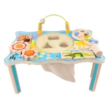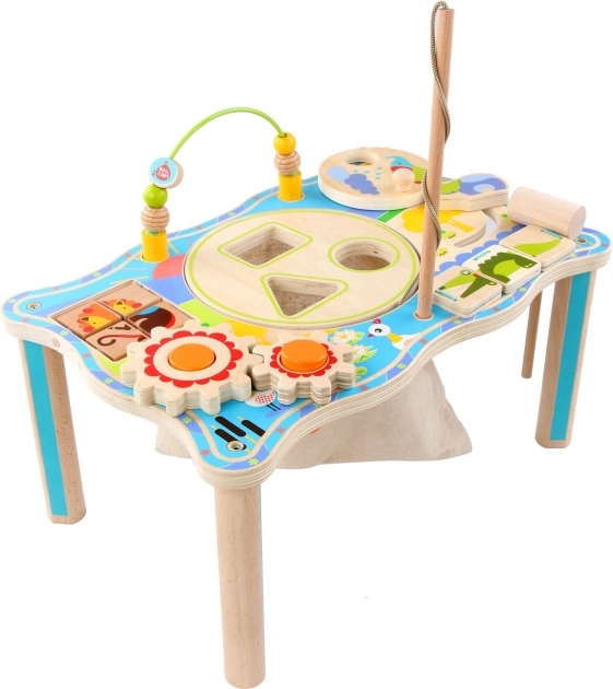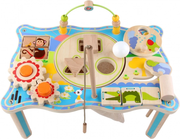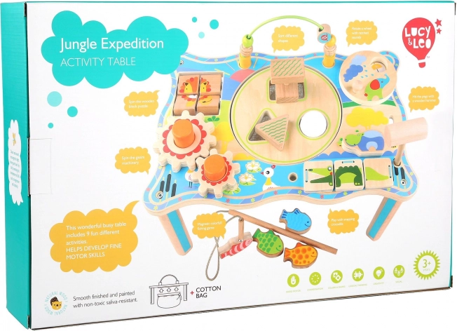 Objavte zábavu aj učenie v jednom s detským stolíkom LUCY & LEO – Expedícia v džungli. Tento kvalitný drevený multifunkčný stolík ponúka pestrú škálu aktivít na rozvoj detských zručností: magnetické chytanie rybičiek, ozubené kolieska, guľôčkové bludisko, zatláčadlo aj vkladacie tvary. Robustné prevedenie, hravý dizajn a praktické ľanové vrecúško na zber dielikov zaistia dlhé hodiny zmysluplnej hry.