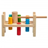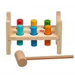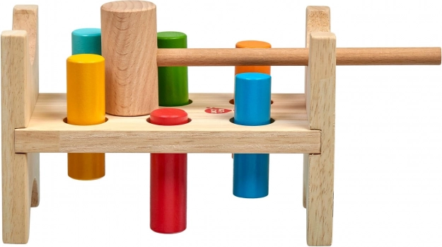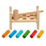 Šesť farebných kolíkov a drevené kladivko učia deti presnému úchopu, sile úderu a koordinácii oko–ruka.