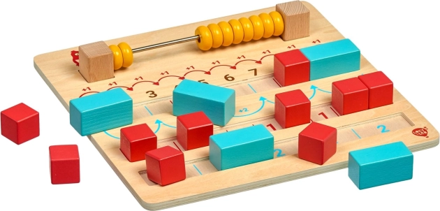 Súčasťou je 10 červených kociek a 5 modrých kvádrov, ktoré vizuálne znázorňujú hodnoty a podporujú porozumenie základným početným operáciám.