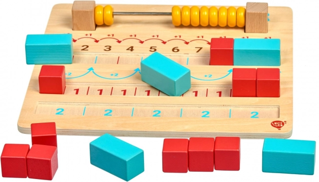 Drevená vzdelávacia sada pre prvé krôčiky v matematike od LUCY & LEO rozvíja logiku, počítanie a jemnú motoriku formou hry. Obsahuje hladkú drevenú dosku s počítadlom a drážkami pre kocky, 10 červených kociek a 5 modrých kvádrov na základy sčítania a odčítania. Bezpečné prevedenie a odolné materiály sú ideálne pre deti od 3 rokov.