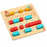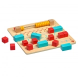 - Drevená doska s počítadlom, 10 červených kociek, 5 modrých kvádrov