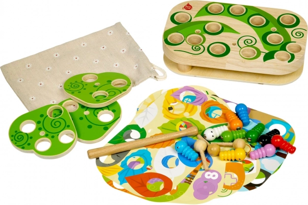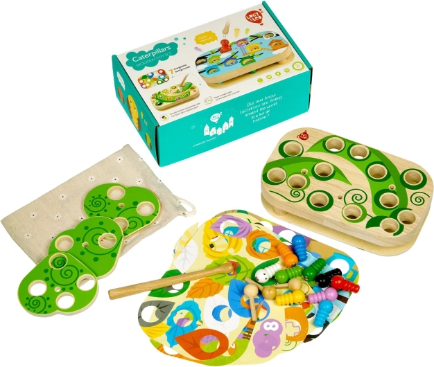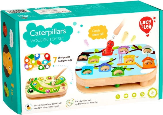 Zábavná a vzdelávacia hra Lucy & Leo chytanie húseníc rozvíja jemnú motoriku, logické myslenie a koordináciu oko–ruka. Pomocou magnetickej paličky deti chytajú farebné húsenice do otvorov v drevenej doske a skúšajú rôzne úrovne náročnosti s vymeniteľnými predlohami a otáčavými listami.