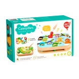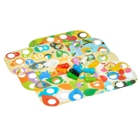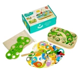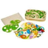 Vďaka 9 vymeniteľným predlohám a otáčavým listom možno náročnosť prispôsobiť veku aj zručnostiam dieťaťa. Hra je povrchovo upravená bezpečnými, netoxickými farbami odolnými voči slinám a menšie diely ľahko uložíte do ľanového vrecka.