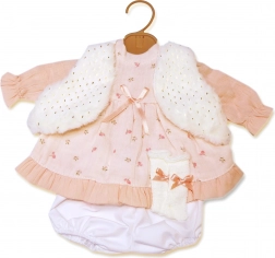 Zlaďte šatník svojej bábiky: ružové šaty, mäkká biela vestička, nohavičky a praktické ramienko na jednoduché uloženie.