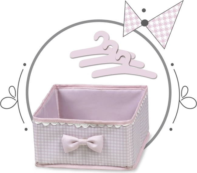 Objavte nežne ružovú kolekciu Niza s touto krásnou a praktickou skriňou pre bábiky, ktorá v sebe spája úložný priestor a prebaľovacie centrum. Spodná časť ponúka šatníkovú tyč a zásuvku na uloženie oblečkov, horný nástavec slúži ako prebaľovací pult s potlačou v dizajne kolekcie.