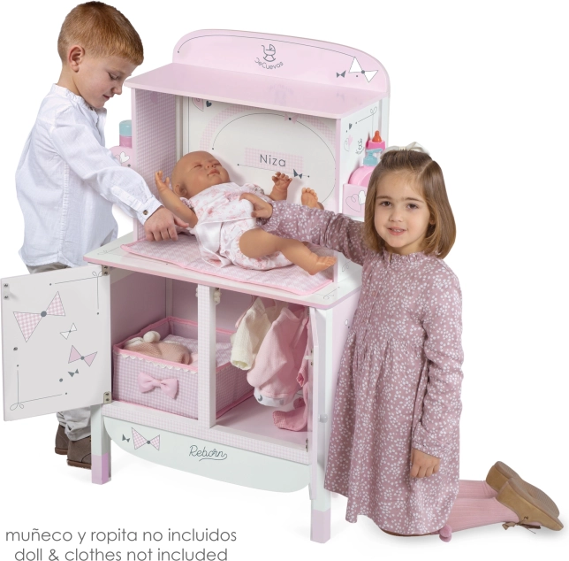 Vďaka precíznemu španielskemu dizajnu a starostlivo vybraným materiálom pôsobí skriňa ľahko a čisto. Praktické rozmery zaisťujú stabilitu aj dostatok miesta pre všetky nevyhnutnosti k starostlivosti o bábiku až do dĺžky 45 cm.