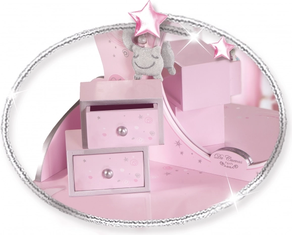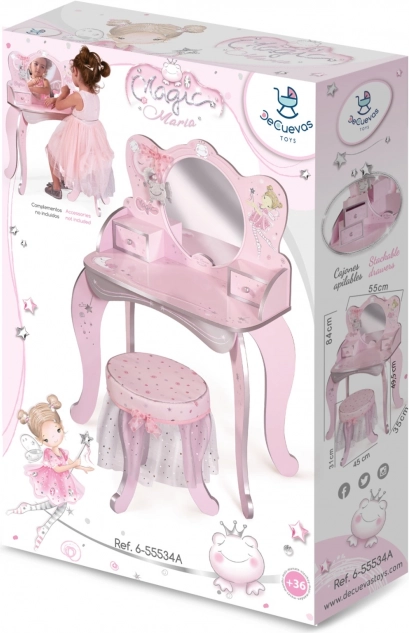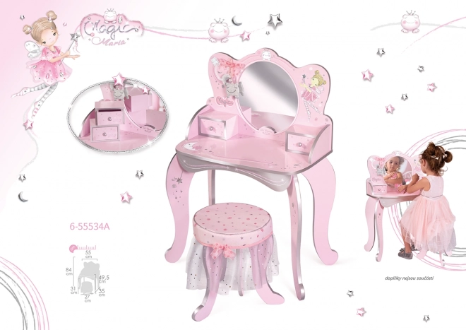 Tento rozprávkový detský toaletný stolík Magic Maria v ružovom prevedení s dekoratívnymi prvkami ponúka čarovný priestor pre malé parádnice na hranie a skladovanie drobných predmetov.