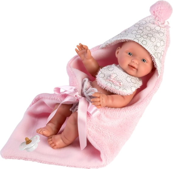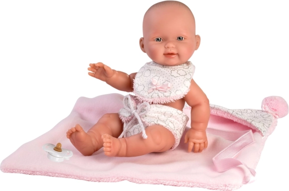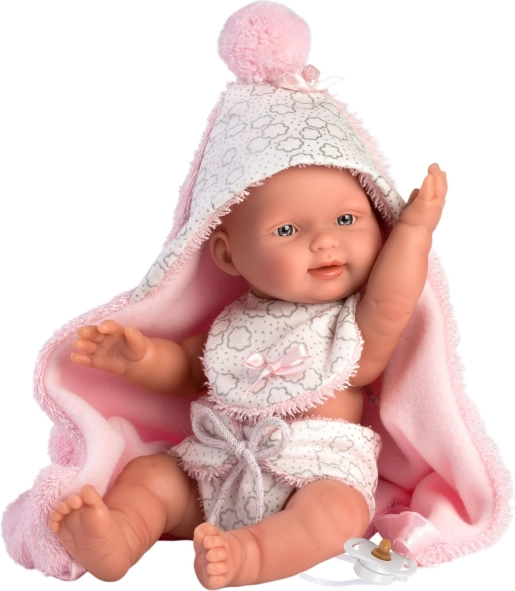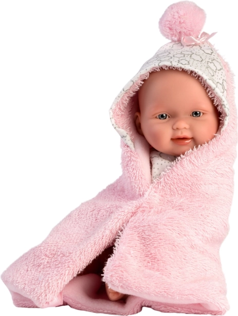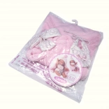 Tento dvojdielny oblek je navrhnutý špeciálne pre bábiku novorodenca New Born o veľkosti 26 cm. Obsahuje obojstrannú deku s kapucňou, ktorá chráni bábiku a dodáva jej vzhľad skutočného bábätka.