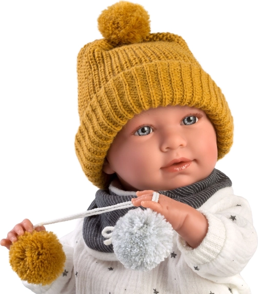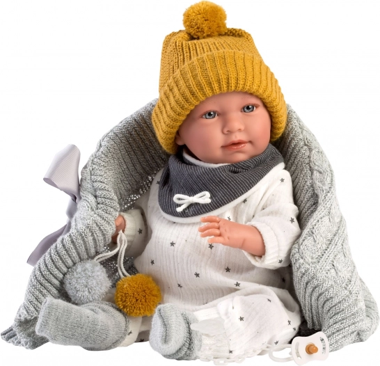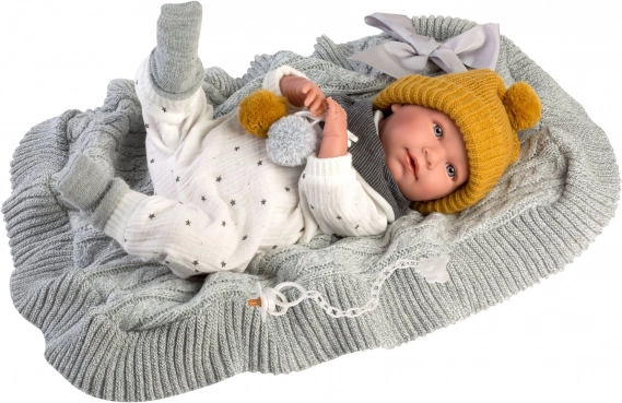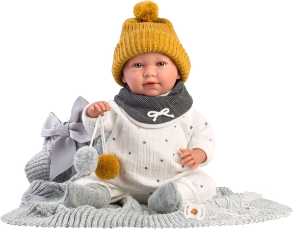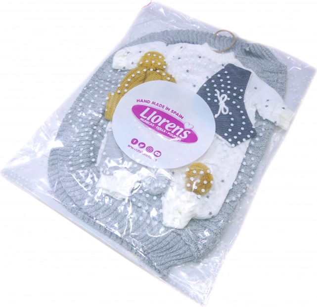 4-dielny outfit s ozdobnou dekou s mašľou a bambuľkami pre bábiku NEW BORN Llorens veľkosť 40-42 cm. Vyrobené v Španielsku, balené v plastovom obale s plastovým alebo kartónovým popruhom. Odporúčaný vek od 3 rokov.
