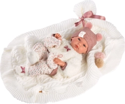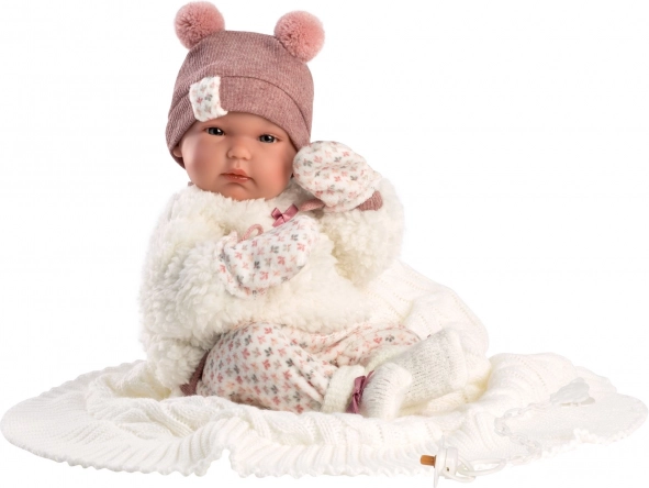 Bábika je štýlovo oblečená a obsahuje všetky potrebné doplnky, vrátane svetrov, čiapky a dekoratívneho cumlíka.