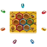 Výuková hra Včelí plást Montessori podporuje rozvoj motorických zručností a samostatnosť detí. Obsahuje základňu z masívneho dreva a sedem farebných včielok, ktoré deti umiestňujú do zodpovedajúcich otvorov pomocou priloženej červenej plastovej pinzety.