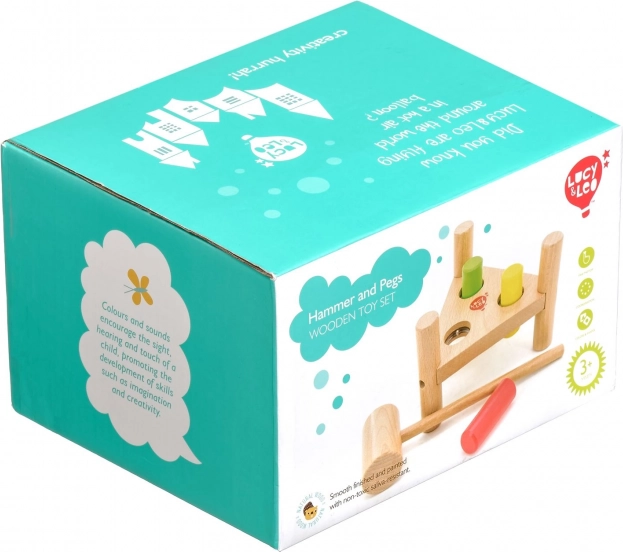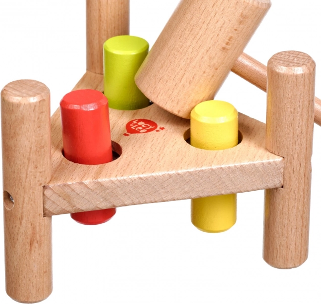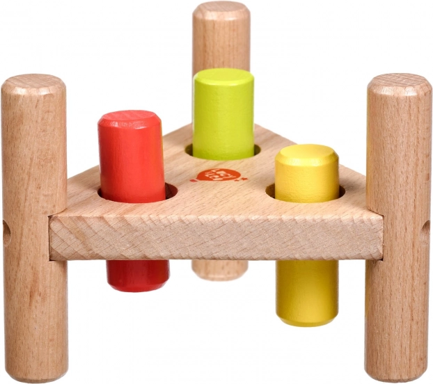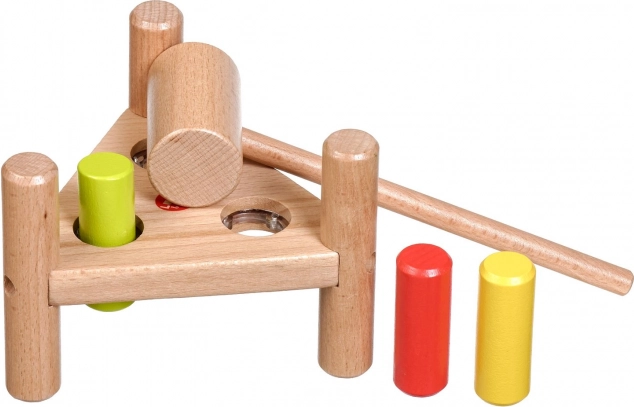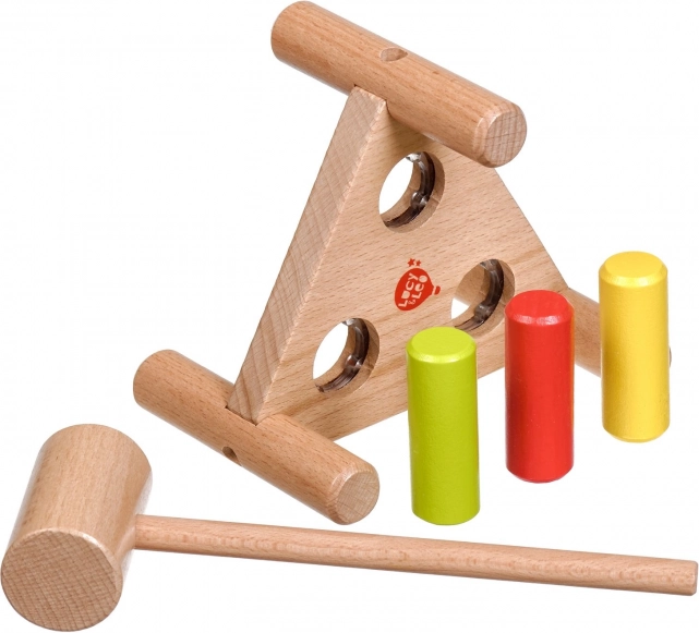 Zábavná drevená zatĺkačka v netradičnom tvare trojuholníka podporuje jemnú motoriku, koordináciu oko–ruka a sústredenie. Tri farebné kolíky sa ľahko zatĺkajú dreveným kladivkom a po ich zatlčení stačí stojan otočiť a zábava môže začať znova.