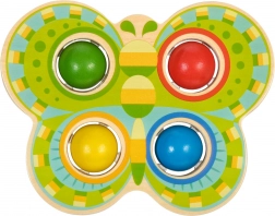 Farebný motýľ s otvormi pre štyri gule (zelená, červená, žltá, modrá) pomáha s rozpoznávaním farieb a udržiava pozornosť.