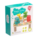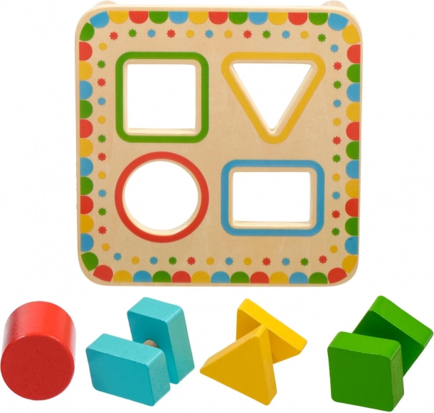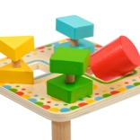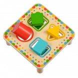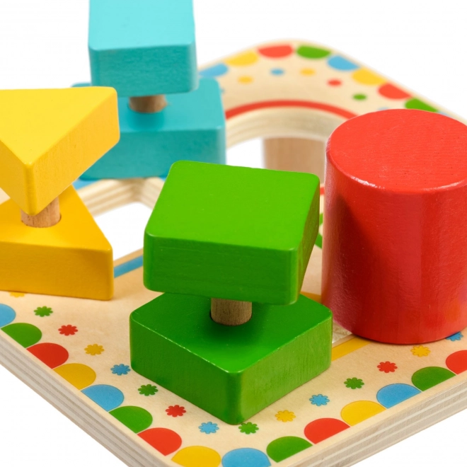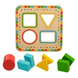 Doska na stabilných nožičkách má štyri farebne orámované otvory, ktoré ladia s farbami jednotlivých dielikov. Sada je ideálna na samostatnú hru aj spoločné objavovanie s rodičmi a skvele sa hodí ako kvalitná drevená edukatívna hračka pre predškolákov.