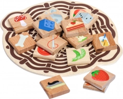Táto premyslená montessori pomôcka učí deti rozlišovať, čo je vhodné jesť a čo nie. Na drevených podložkách je zobrazený tanier s lyžicou a prútený košík, kam deti prikladajú doštičky s obrázkami ovocia, zeleniny, sladkostí či nápojov, ale aj kľúčov, žiaroviek, ihiel alebo ceruziek. Hra prirodzene podporuje spoznávanie sveta, koncentráciu a komunikačné zručnosti.