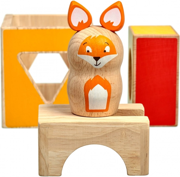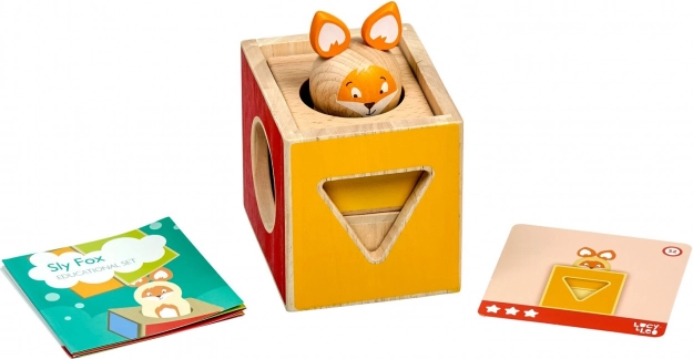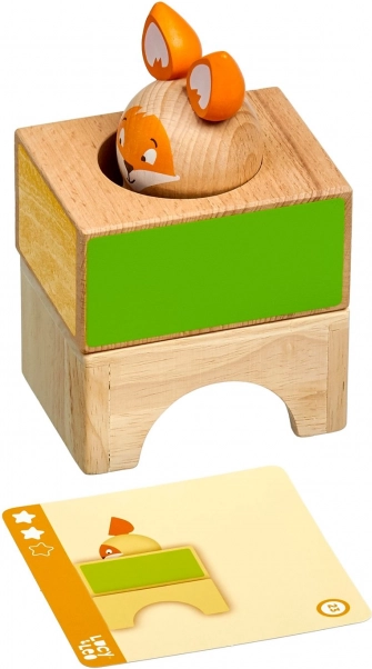 Táto drevená vzdelávacia hra obsahuje tri masívne kocky s výrezmi rôznych tvarov, drevenú figúrku líšky a sadu obojstranných kariet s úlohami rôznej náročnosti. Deti podľa predlôh stavajú a kombinujú kocky tak, aby sa líška správne „schovala“, čím trénujú stratégiu a priestorové vnímanie.