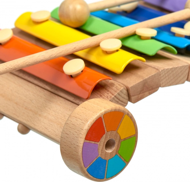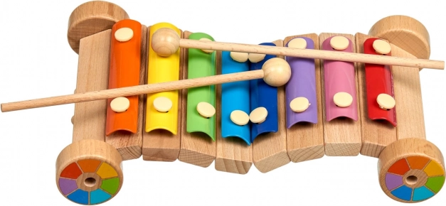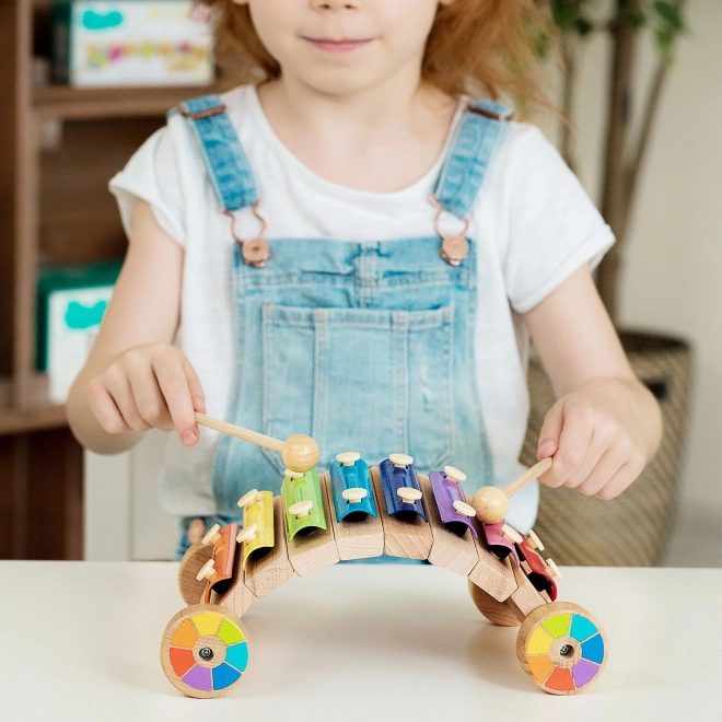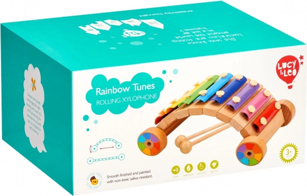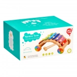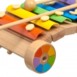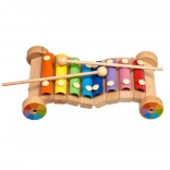 Veselý dúhový xylofón na drevenom podvozku s kolieskami rozvíja hudobný sluch, rytmus a jemnú motoriku. Farebné kovové lamely vydávajú čisté tóny, súčasťou sú 2 drevené paličky. Bezpečné prevedenie a robustné spracovanie z neho robia ideálnu edukačnú hračku pre predškolákov.