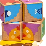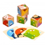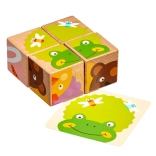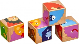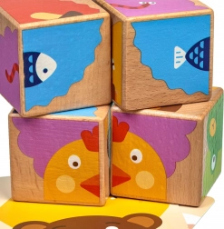 Zo štyroch drevených kociek deti poskladajú až šesť rôznych obrázkov podľa priložených predlôh. Každé otočenie prináša nový, zábavný úkol a udržiava pozornosť malých staviteľov.