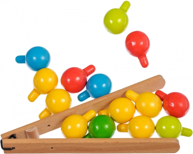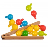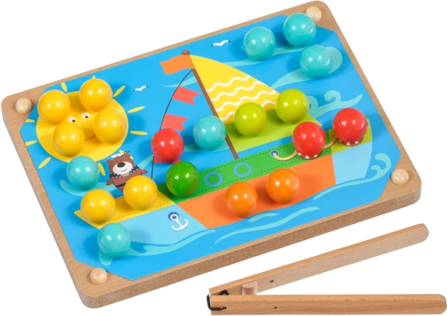 Drevený podstavec s otvormi, farebné kolíky a pinzeta motivujú deti k presnému úchopu a trénujú jemnú motoriku aj koordináciu oko–ruka.