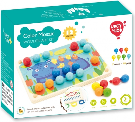 Set ponúka bohaté herné možnosti: skladanie mozaiky podľa predlôh aj vlastnej fantázie, triedenie podľa farieb, počítanie kolíkov alebo precvičovanie úchopu. Po hraní sa kolíky jednoducho uložia do ľanového vrecúška – všetko je tak prehľadné a pripravené na ďalšie tvorenie.