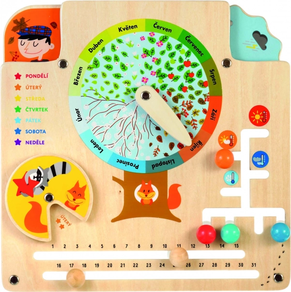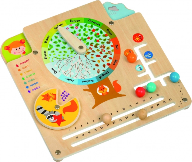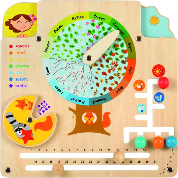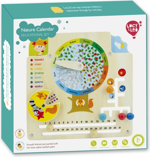 Drevený kalendár prírody LUCY & LEO je ideálna pomôcka na hravé učenie. Uprostred dosky nájdete listnatý ovocný strom s ukazovateľom 12 mesiacov, vďaka ktorému si deti ľahko spoja zimu so snehom, jar s kvetmi, leto s ovocím a jeseň s opadávajúcimi listami. Deti sa zároveň učia rozpoznávať dni v týždni, počet dní v mesiaci, počasie, teplotu a vhodné oblečenie pre rôzne podmienky.