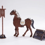 Postavte si impozantného bojovného koňa, ktorý vyniká detailne spracovaným strieborným brnením s kovovými prackami a pohyblivými prednými končatinami. Model je vyrobený z kvalitného dreveného materiálu a doplnený prvkami z kože, vďaka čomu pôsobí autenticky a odolne. Súčasťou je tiež totemová bojová vlajka a mobilná zábrana, ktoré podporia kreatívne príbehy a scénky.