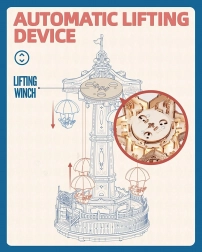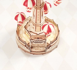 Táto prepracovaná 3D drevená skladačka je inšpirovaná klasickou padákovou vežou zo zábavného parku. Šesťuholníková základňa a bočné priesvitné okná prepúšťajú teplé svetlo, ktoré podčiarkuje jedinečnú atmosféru. Kolotoč je poháňaný batériovým motorčekom a osvetlený LED svetlami, pričom dotykové ovládanie umožňuje samostatne riadiť pohyb aj zvuk.