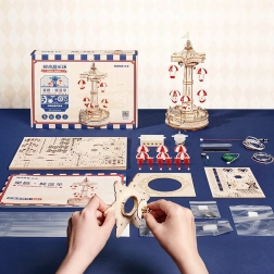 Vychutnajte si kúzlo zábavného parku doma s touto detailnou 3D skladačkou hracej skrinky – padákový kolotoč. Model ponúka motorový pohon, LED osvetlenie, dotykové ovládanie pohybu a zvuku a prehráva romantickú melódiu Falling Flower. Čaká vás 184 precízne vyrezaných dielikov, vysoká náročnosť a pôsobivý výsledok, ktorý vytvorí atmosféru vďaka priesvitným oknám a trom svetelným bodom.