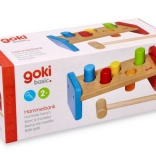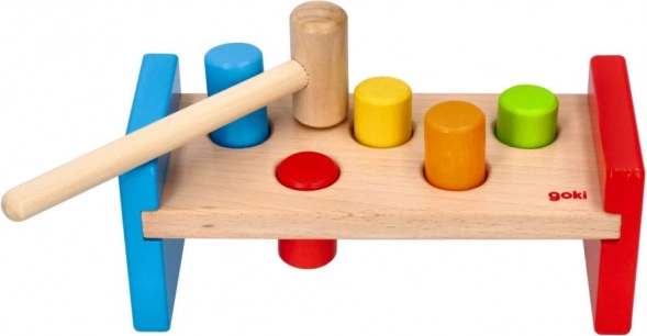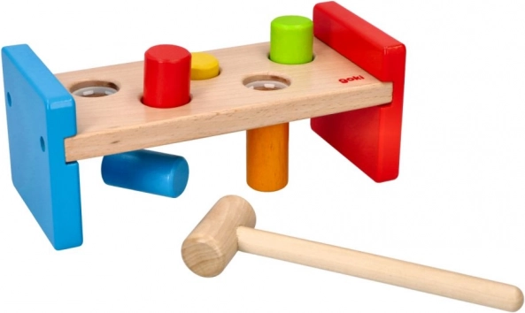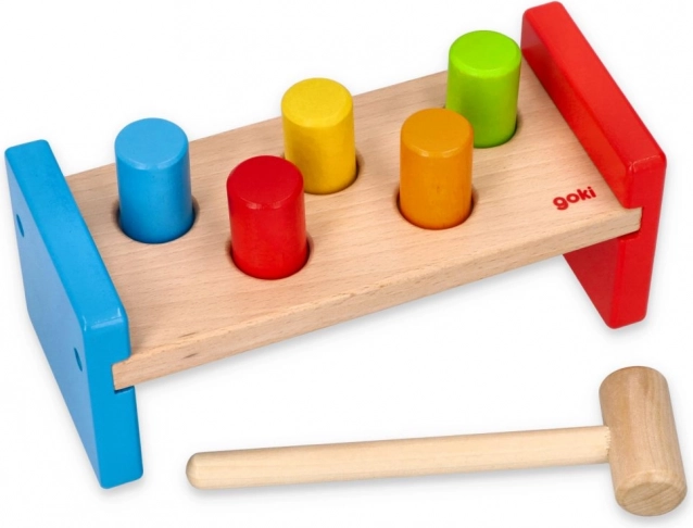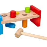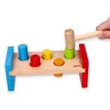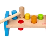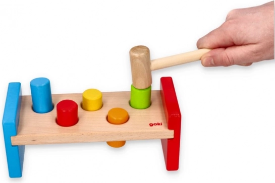 Táto robustná zatĺkacia lavička je vyrobená z odolného, hladko opracovaného dreva s bezpečnými, netoxickými farbami. Deti môžu pomocou dreveného kladivka precvičovať úchop, silu úderu aj trpezlivosť, zatiaľ čo farebné kolíky lákajú k opakovanej hre.