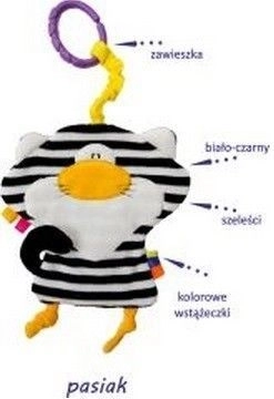 Roztomilá plyšová hračka s praktickým pútkom na zavesenie poteší každé bábätko od narodenia. Kontrastné čierno‑biele prúžky, mäkké materiály a bezpečné prevedenie podporujú zmyslový rozvoj, upokojujú a zabavia na cestách aj doma. Jednoduchá údržba a kompaktné rozmery z nej robia ideálneho spoločníka do kočíka, autosedačky aj postieľky.
