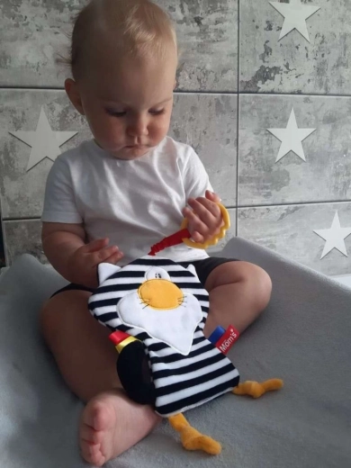 Táto hebká mačička s pútkom bola navrhnutá pre najmenšie deti. Vysoký kontrast čierno‑bielych vzorov priťahuje pozornosť novorodencov, zatiaľ čo jemné textúry a detaily – vrátane žltého nošteka a bezpečného krúžku na zavesenie – podporujú zrakové a hmatové vnímanie. Vďaka ľahkej konštrukcii ju dieťa ľahko uchopí a maznáčik sa stane spoľahlivým parťákom na upokojenie aj zaspávanie.
