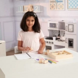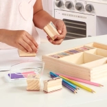Pečiatky a ceruzky sú úhľadne uložené v elegantnej drevenej krabičke s priehradkami, čo zabezpečuje jednoduchú organizáciu a prenášanie.