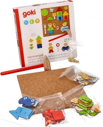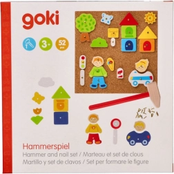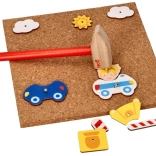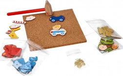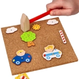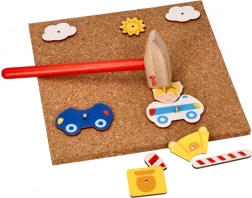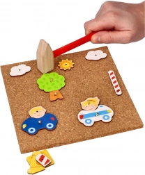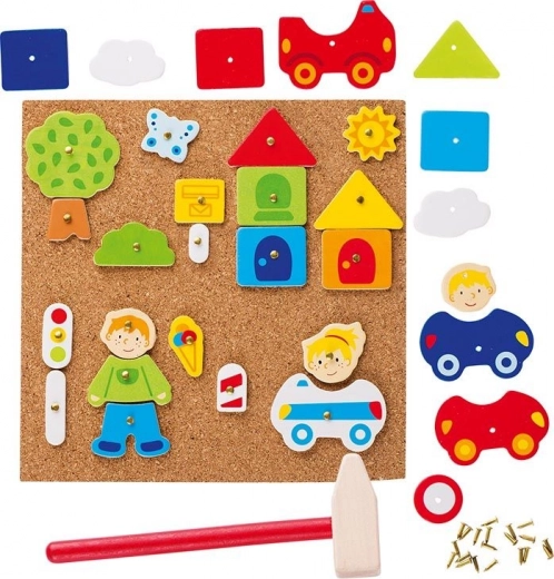 Korková zatĺkačka Mesto je zábavným a edukatívnym setom pre deti od 3 rokov. Tento set obsahuje farebné drevené tvary, ktoré môžu deti zatĺkať na korkovú dosku.