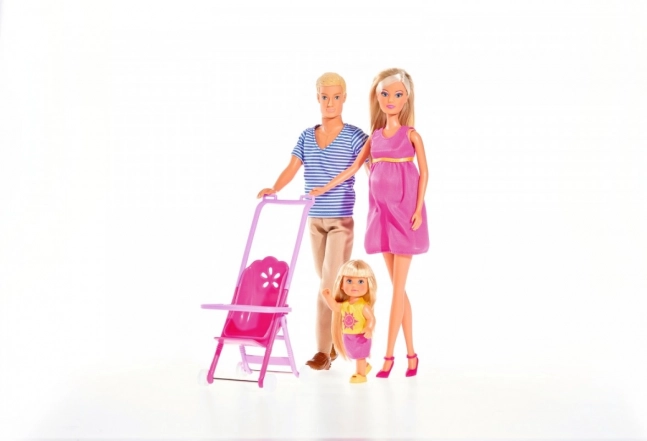 Súprava Steffi Happy Family obsahuje 3 bábiky: tehotnú Steffi, Kevina a malú Evi v kočíku.Súčasťou je tiež viac než 19 doplnkov.