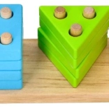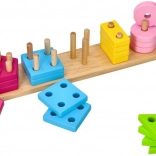 Zábavná drevená skladačka kombinuje triedenie farieb a tvarov s navliekaním na kolíky s rôznym počtom otvorov. Rozvíja jemnú motoriku, koordináciu oko–ruka a logické myslenie, vyrobená z masívneho dreva pre bezpečné a odolné hranie.