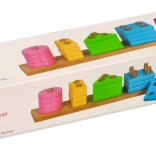 Táto drevená triediaca skladačka kombinuje učenie farieb a geometrických tvarov s praktickým navliekaním dielikov na kolíky s rôznym počtom otvorov. Deti pri hre precvičujú jemnú motoriku, úchop, koordináciu oko–ruka aj logiku.