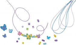 Sada obsahuje drevené koráliky v rôznych tvaroch (motýliky, kvety, guličky) a textilné šnúrky – ideálne na výrobu náhrdelníkov a náramkov. Rozvíja jemnú motoriku a tvorivosť, odporúčané od 4 rokov.