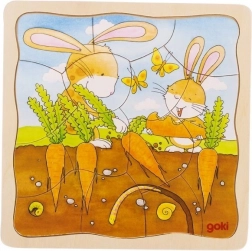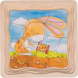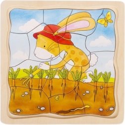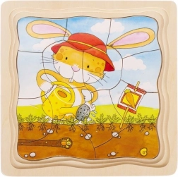 Toto viacvrstvové drevené puzzle predstavuje štyri fázy vývoja mrkvy – od semienka až po zber. Každá vrstva má iný obrázok a odlišný počet dielikov, čím prirodzene zvyšuje náročnosť a udržiava pozornosť detí. Pevná drevená doska s rámikom zaisťuje pohodlné a stabilné skladanie.