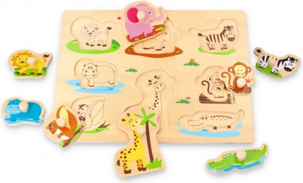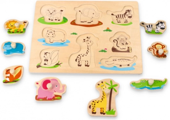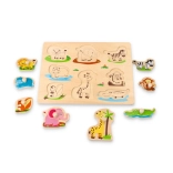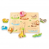Puzzle pomáha deťom rozpoznávať rôzne tvary a zvieratá, ako je žirafa, slon alebo krokodíl.