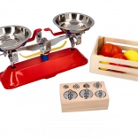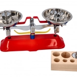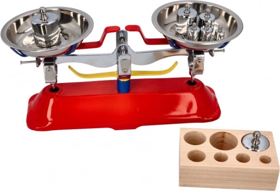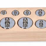 Presné závažia v elegantnom drevenom držiaku uľahčujú kalibráciu a zábavné experimenty s meraním.