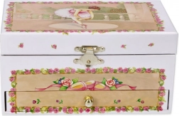 Elegantná hracia šperkovnica so zásuvkou a roztomilou baletkou poteší každú malú parádnicu. Po otvorení sa rozoznie melódia Labutie jazero a balerína sa roztočí pred zrkadielkom. Šperkovnica ponúka praktický úložný priestor na drobnosti a šperky a je krásnym dekoratívnym doplnkom detskej izby.
