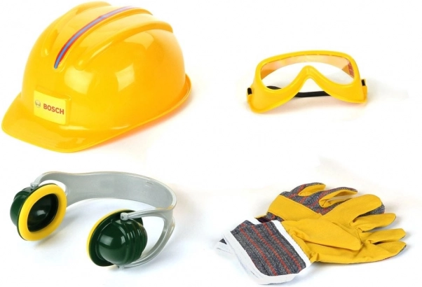 Súčasťou je žltá prilba s nastaviteľným zapínaním, žlto‑zelené chrániče sluchu, žlté ochranné okuliare s priehľadnými plastovými „sklíčkami“ na elastickej gumičke a pohodlné rukavice v žlto‑sivom prevedení. Všetko je ľahké, prispôsobené detským potrebám a ideálne ako doplnok k detským dielňam a súpravám náradia.