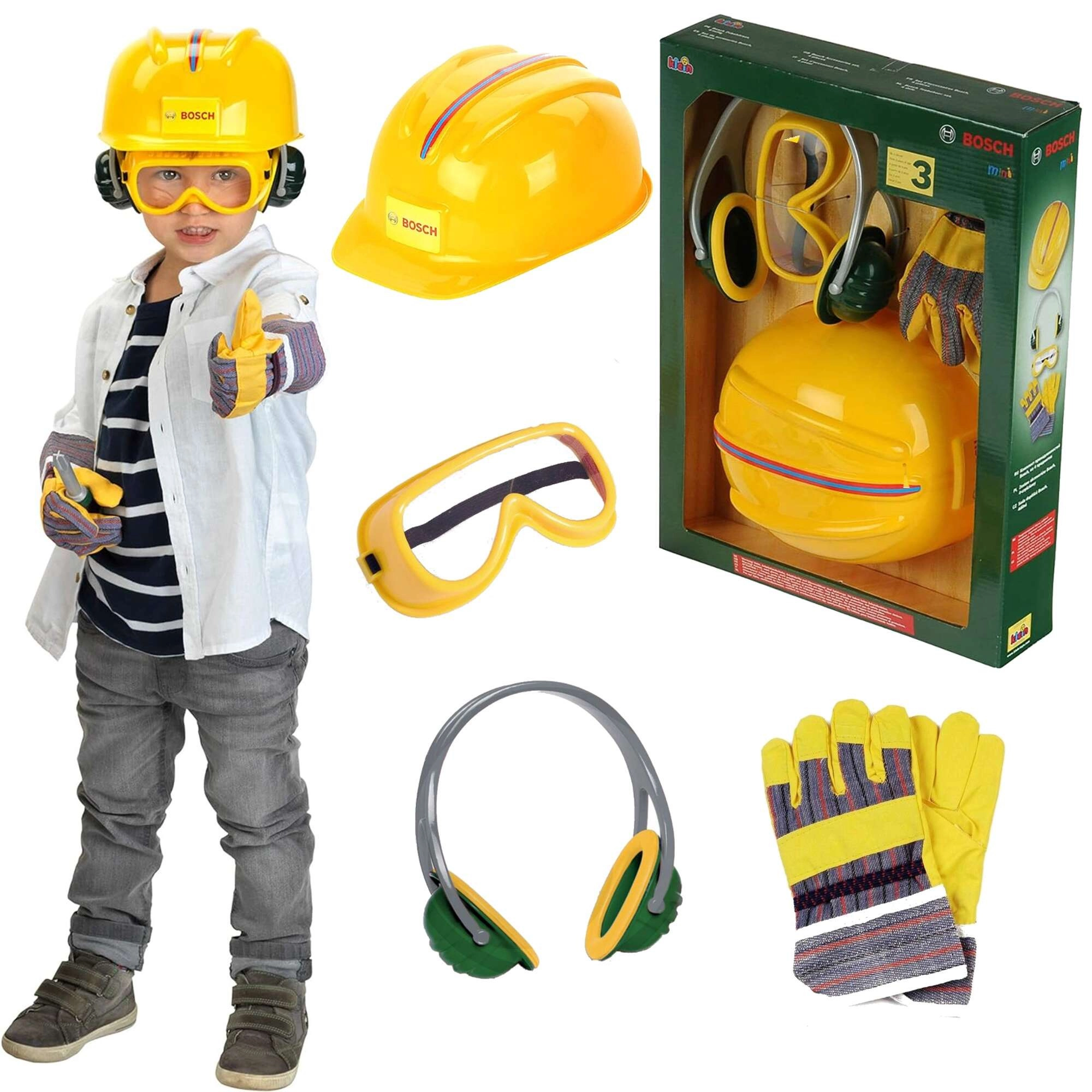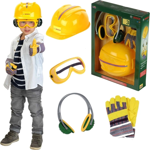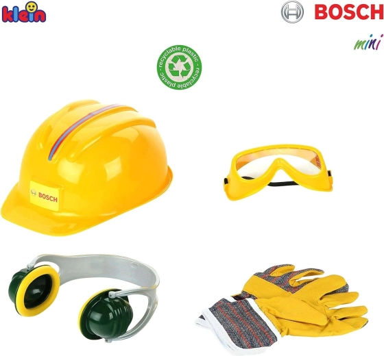 Zábavná a bezpečná sada pre malých staviteľov od značky Klein s licenciou BOSCH mini obsahuje detskú ochrannú prilbu, okuliare, slúchadlá a rukavice. Perfektné na hraní sa na opravára, rozvoj fantázie a role-play s dôrazom na „bezpečnosť pri práci“ v detskom poňatí.
