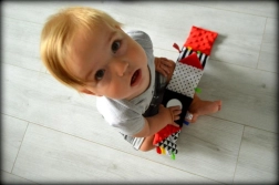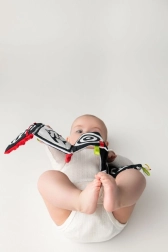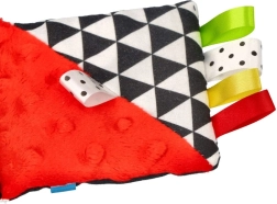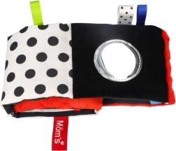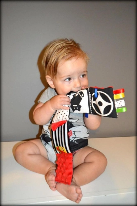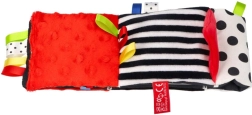 Červená senzorická knižka je navrhnutá pre novorodencov a dojčatá 0+. Vysoký kontrast čiernobielych grafík s červenými akcentmi prirodzene púta detskú pozornosť, zatiaľ čo mäkké polstrovanie a rozmanité textúry pozývajú k dotyku. Vďaka kompaktným rozmerom ju ľahko vezmete do kočíka alebo pripevníte do zorného poľa bábätka.