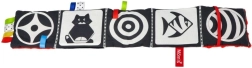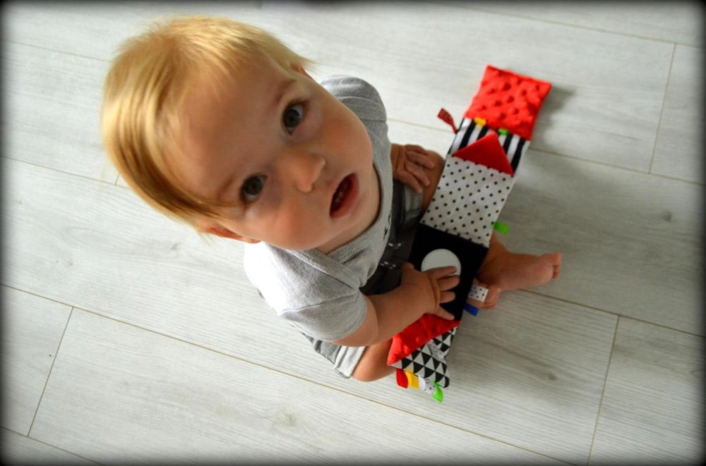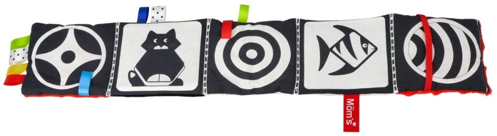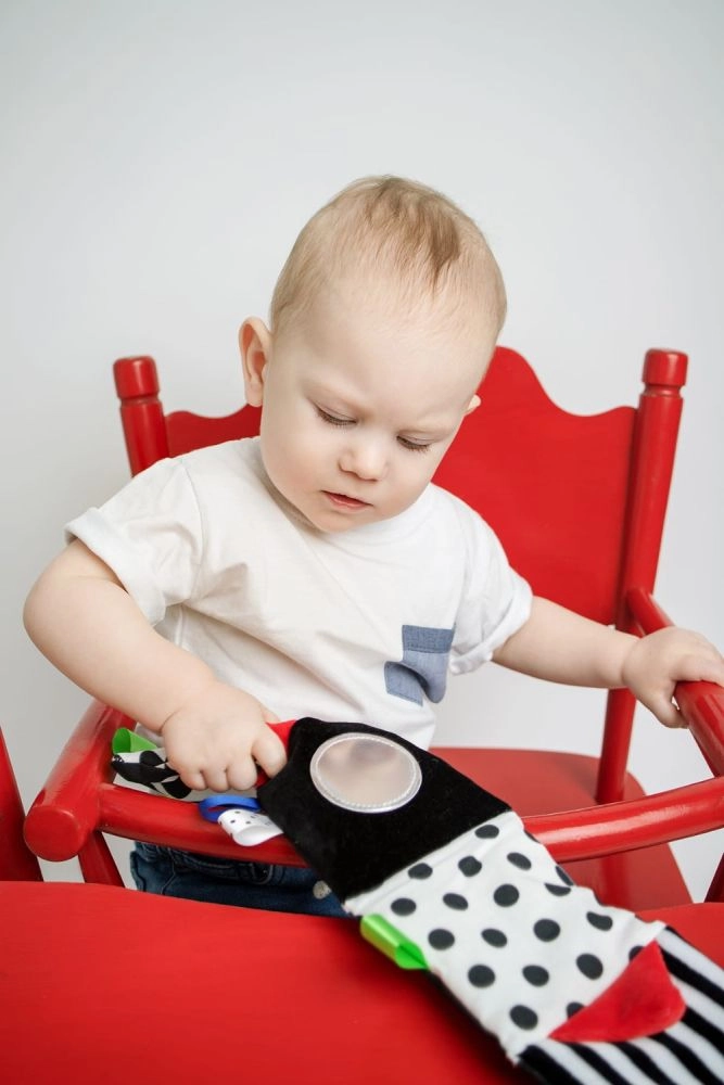 Čiernobiele motívy s červenými akcentmi priťahujú pozornosť novorodencov a pomáhajú rozvíjať ostrosť videnia a sledovanie objektov.