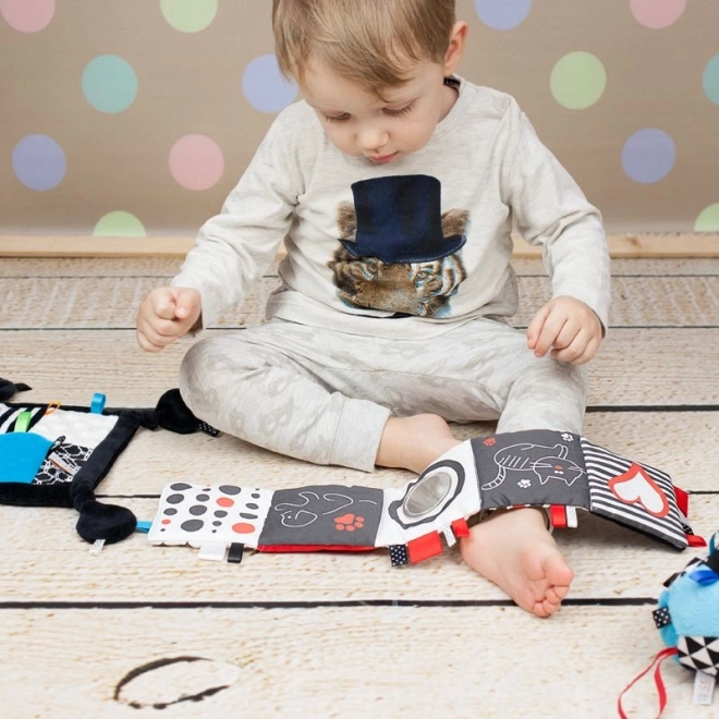 Táto mäkká textilná knižka je navrhnutá špeciálne pre novorodencov a dojčatá. Kontrastné vzory priťahujú pozornosť dieťatka a podporujú vývoj zraku, zatiaľ čo rôznorodé textúry a šušťavé prvky povzbudzujú hmatové vnímanie a zvedavé pršteky. Integrované bezpečné zrkadielko pomáha dieťaťu objavovať vlastný odraz a učiť sa sebakontaktu.