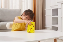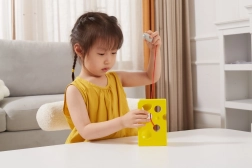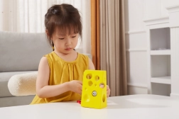 Tento žltý „syr“ s otvormi a červenou šnúrkou s myškou motivuje deti k precvičovaniu prštekov zábavnou formou. Prevliekanie cez rôzne umiestnené otvory podporuje manuálnu zručnosť, súmernosť pohybov a logické uvažovanie.