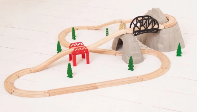 Vydajte sa na dobrodružstvo s touto drevenou vlakovou sadou, ktorá prináša prekrásnu vysokohorskú dráhu. Sada obsahuje:
