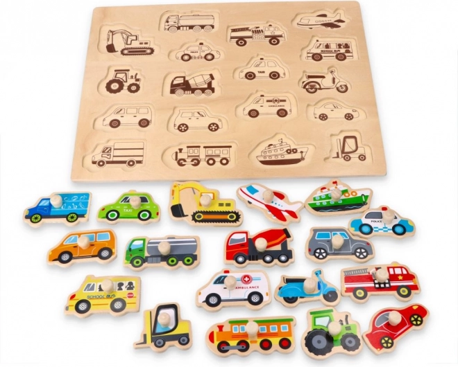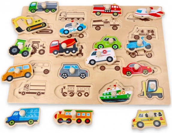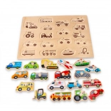Táto kvalitná vkladačka z prírodného dreva ponúkne deťom bezpečnú a pútavú hru. Každý dielik predstavuje rôzne vozidlo a má praktické drevené gombíkové úchyty pre jednoduché uchopenie malými ručičkami. Na podložke sú natlačené obrysy, ktoré deťom pomáhajú správne dieliky umiestniť a učia ich rozpoznávať tvary a farby.
