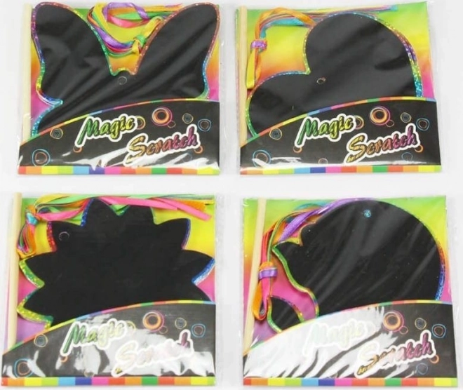 Jednoduchý postup, efektný výsledok – zoškrabte predtlačené línie a pod čiernou vrstvou sa objavia dúhové farby. Hotové obrázky môžete vďaka farebným stužkám hneď zavesiť a ozdobiť detskú izbu. Ideálne na tvorenie doma, v škole aj v krúžkoch.